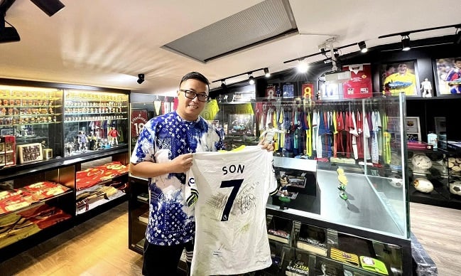 Businessman Quoc Cuong takes a photo with the shirt given by Son Heung-min. Photo: Businessman Quoc Cuong