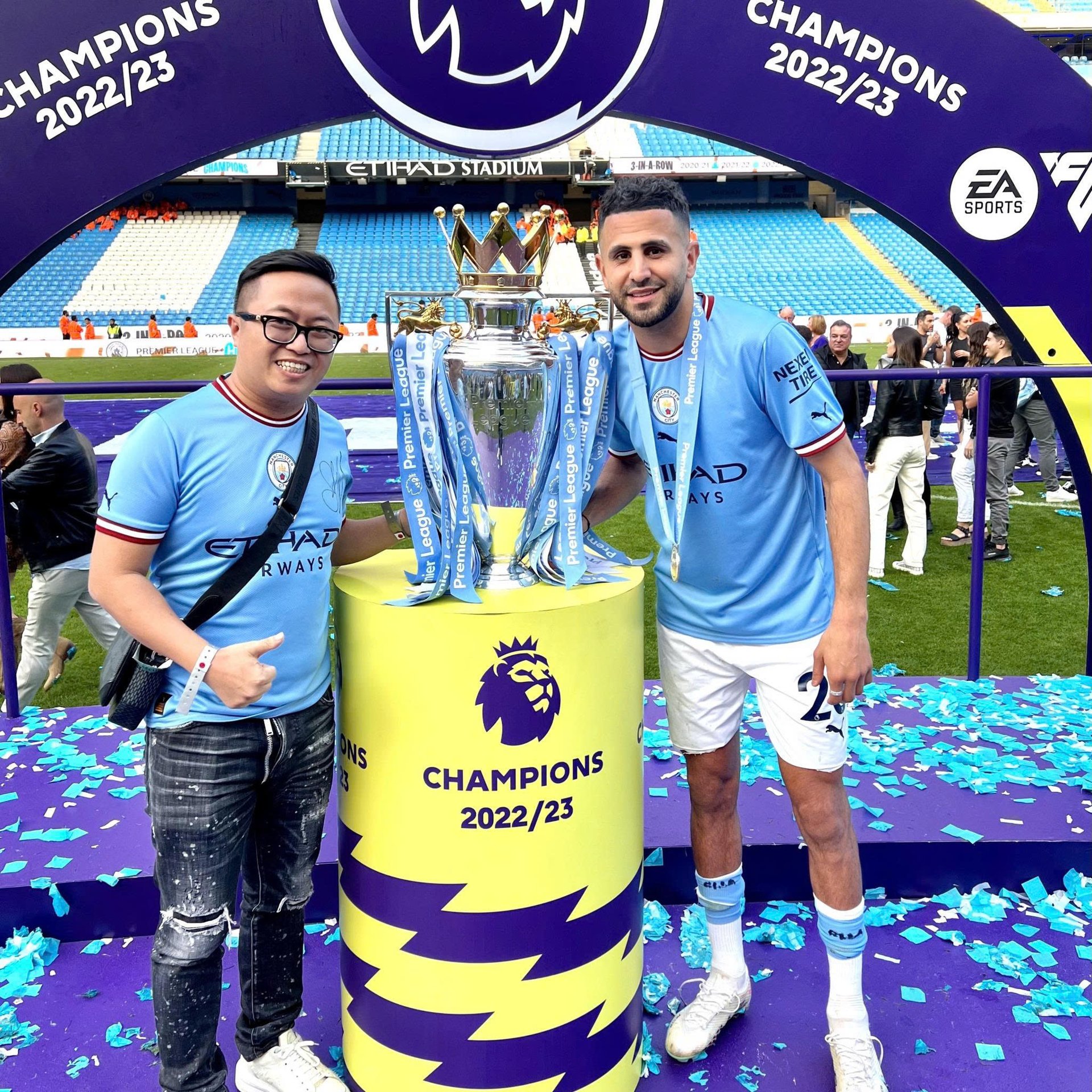 Businessman Quoc Cuong took a souvenir photo with Mahrez with the Premier League trophy during Manchester City's treble season. Photo: Businessman Quoc Cuong